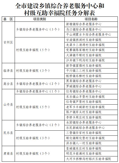 对甘州区残疾人托养中心、临泽县居家养老服务中心、民乐县正午阳光社会工作服务中心进行改造提升,创建省级示范中心,推进残疾人日间照料服务标准化建设、规范化管理、优质化服务。
