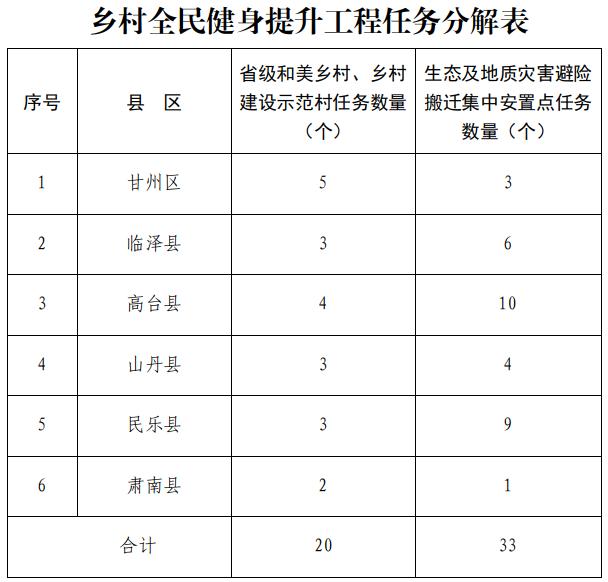 在全市符合条件的省级和美乡村、乡村建设示范村和生态及地质灾害避险搬迁集中安置点支持建设53个乡村全民健身提升工程,其中:支持省级和美乡村、乡村建设示范村建设20个,生态及地质灾害避险搬迁集中安置点建设33个。