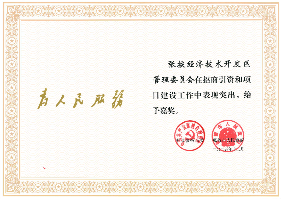 近日,张掖经济技术开发区管理委员会因在招商引资和项目建设工作中表现突出,正式获得嘉奖。这一荣誉既是对管委会深耕产业发展、优化营商环境的高度认可,更是对园区以项目为纲、以招商为要,推动高质量发展成效的权威肯定。