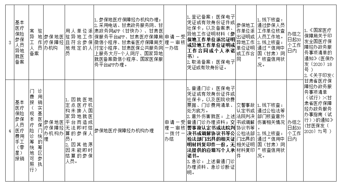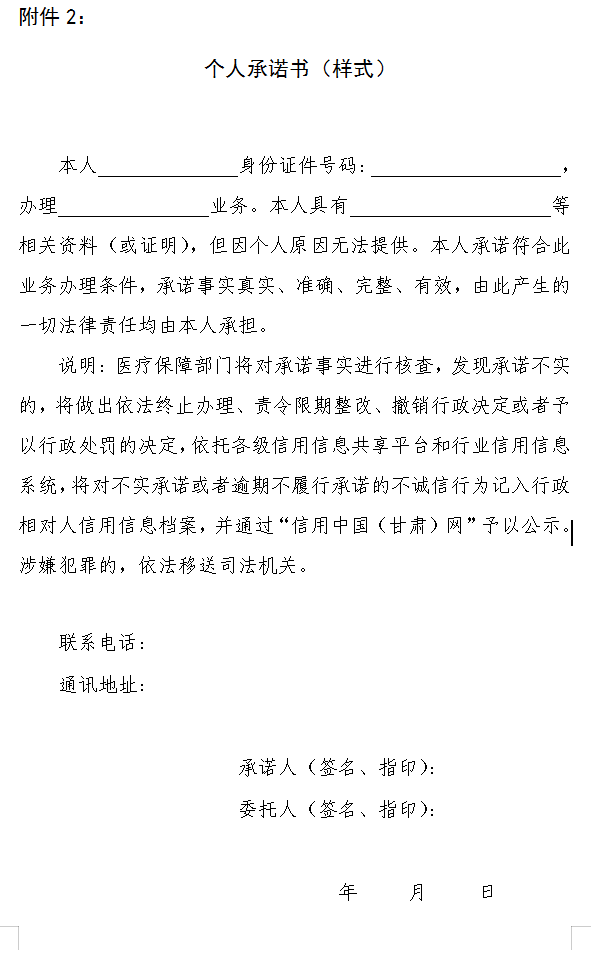 为了深化“放管服”改革,优化医保领域营商环境,根据省政府办公厅《关于贯彻落实甘肃省政务服务事项告知承诺制实施办法的通知》精神,结合医保工作实际,制定印发《甘肃省医疗保障经办政务服务事项告知承诺制实施清单》,请认真遵照执行。
