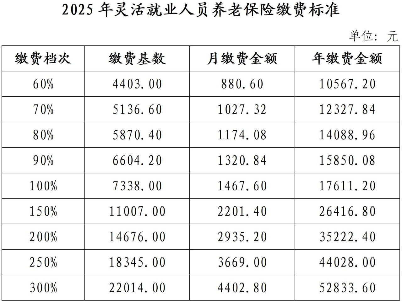 2025年已临近年尾,为切实保障灵活就业参保人员社会保险权益,现就灵活就业参保人员2025年度养老保险费缴纳有关事宜提醒如下: 一、截止日期 根据现行政策规定,灵活就业参保人员当年未缴纳养老保险费的,不能跨自然年度向前缴纳或补缴。灵活就业参保人员缴纳 2025年度养老保险费的截止日期为2025年12月25日,尚未缴纳的在此之前请尽快完成缴纳。 二、缴费标准 2025年度灵活就业人员养老保险月缴费基数按上年度全省全口径城镇单位就业人员月平均工资7338元的60%-300%之间确定,最低缴费标准10567.20元/年,最高缴费标准52833.60元/年,由参保人员自行选择缴费档次进行缴纳。