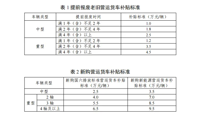 交通运输部、国家发展改革委、财政部发布《关于实施老旧营运货车报废更新的通知》。《通知》指出,对提前报废老旧营运货车、提前报废并更新购置国六排放标准货车或新能源货车、仅新购符合条件的新能源货车,按照报废车辆类型、提前报废时间和新购置车辆动力类型等,实施差别化补贴标准。其中,仅新购新能源城市冷链配送货车补贴标准为3.5万元/辆。补贴政策实施期限至2025年12月31日。